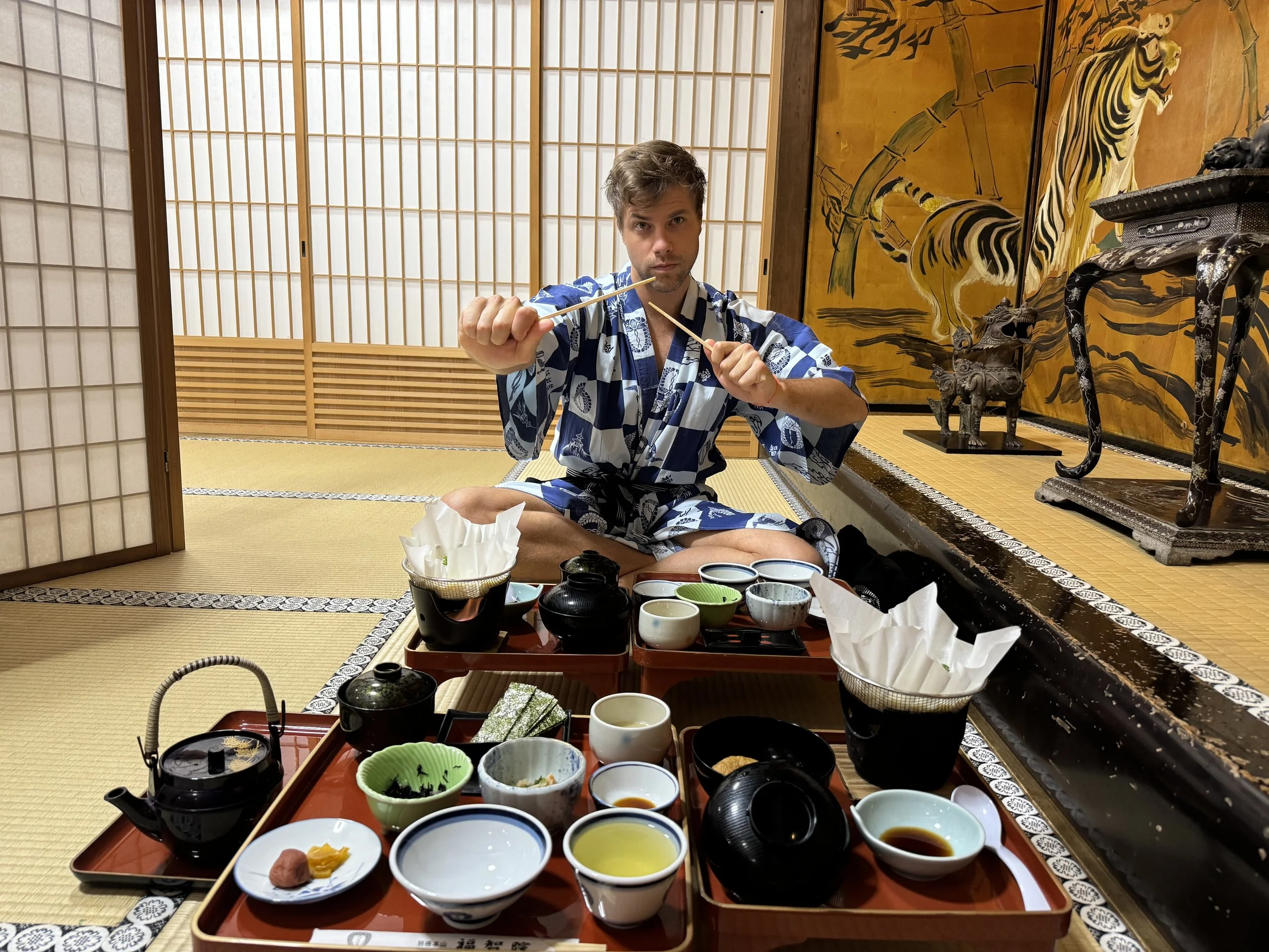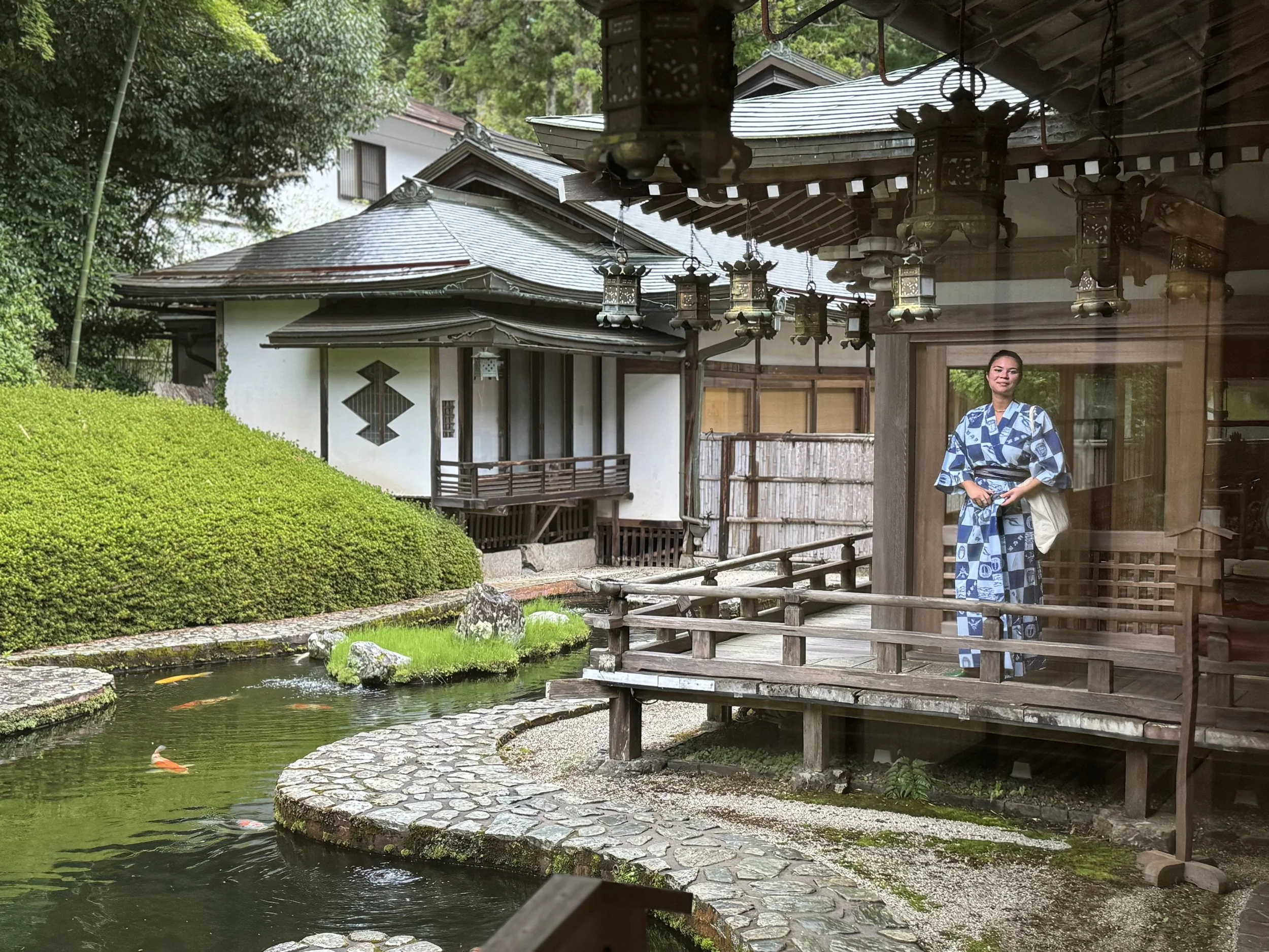 We checked in at Fukuchi-in Temple, our home for the next two nights. This isn’t your typical accommodation—this is a shukubo, a traditional Buddhist temple stay. Paper sliding doors, tatami mats, serene rock gardens, and an atmosphere that just... hushes you. Shoes off. Yukata on. Mind: instantly calmer.